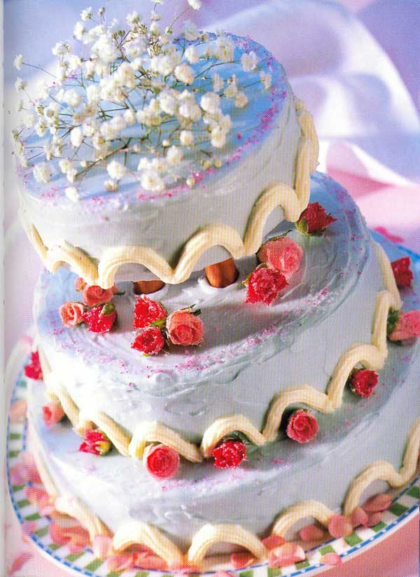 4. Für den Überzug Butter mit Frischkäse und gesiebtem Puderzucker glattrühren. Mit Vanille-Aroma abschmecken. Etwa die Hälfte der Creme mit Speisefarbe hellblau färben. Kleinen Boden auf Karton setzen. Alle Böden erst dünn (um die Krümel zu binden), dann etwas dicker und deckend mit hellblauer Creme überziehen. Weiße Creme in einen Spritzbeutel füllen, Rand der Böden mit Bögen oder Girlanden verzieren. Die Hochzeitstorte kühl stellen.