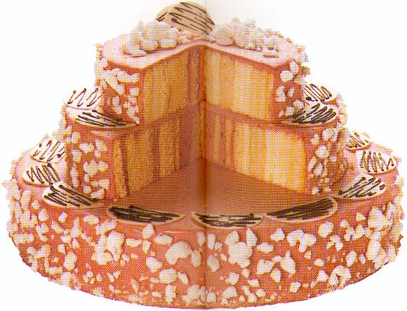 10. Die Torte ganz mit der restlichen Erdbeercreme bestreichen. Backoblaten halbieren, Kuvertüre in ein Pergamentpapiertütchen füllen, die Oblaten damit bespritzen und auf die Stufen der Torten legen. Baiserschalen in kleine Würfel schneiden, den Rand und die oberste Stufe der Torte damit bestreuen und kalt stellen.