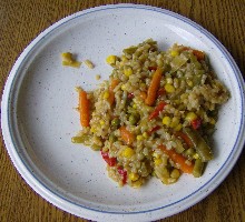 In einen hohen Topf ca 100 ml Wasser geben, aufkochen, gekörnte Ge-müsebrühe dazu, das kleingeschnittene + TK Gemüse zugeben+ Zucker , Essig + Tamari gemörserten Pfeffer, Hitze reduzieren, ca 10-15 min biss-fest dünsten, je nach eigenen Geschmack. Den gelockerten Reis reinge-ben, 1 x umrühren + ca 5 min heiß werden lassen.