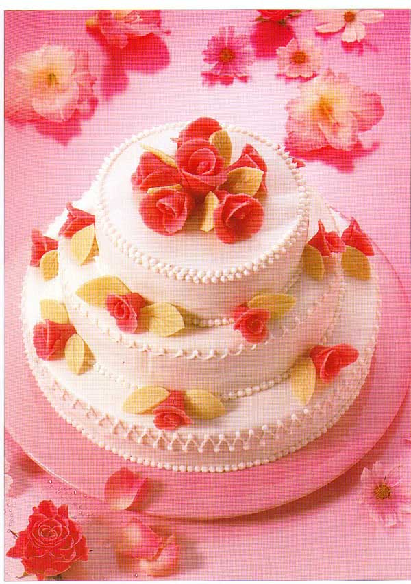 Die Butter geschmeidig rühren, den Pudding esslöffelweise darunter geben. Die Haselnusskerne unter knapp die Hälfte der Buttercreme rühren. Die Schokolade in kleine Stücke brechen, in einem kleinen Topf im heißen Wasserbad zu einer geschmeidigen Masse verrühren, erkalten lassen, unter knapp die Hälfte der Buttercreme rühren. jeden Boden dreimal durchschneiden. Auf zwei Böden eine Untertasse (0 etwa 14 cm) legen, den äußeren Rand abschneiden. Auf drei weitere Böden einen Dessertteller (Ø etwa 20 cm) legen, den äußeren Rand abschneiden, die zwei größten Böden mit Nuss-Buttercreme bestreichen, aufeinander setzen, mit dem dritten Boden bedecken. Die zwei mittleren Böden mit Schokoladen Buttercreme bestreichen aufeinander setzen, mit dem dritten Boden bedecken. Die beiden kleinen Böden mit etwa 1/3 der Vanille Buttercreme füllen, aufeinander setzen. Die Ränder und die oberen Seiten der Torten mit der restlichen Vanille-Buttercreme gleichmäßig dünn bestreichen. Den Puderzucker sieben, mit der Marzipan Rohmasse verkneten. Knapp 1/3 des Marzipans abnehmen, davon 1/3 mit grüner, 1/3 mit roter Lebensmittelfarbe färben, millimeterdick ausrollen. Blütenblätter und Blätter ausschneiden (am besten mit Hilfe einer Papierschablone), aus mehreren Blütenblättern Blüten formen, etwas zusammendrücken. Knapp die Hälfte des restlichen Marzipans millimeterdick ausrollen, eine Platte (Ø etwa 28 cm) ausschneiden, auf die größte zusammengesetzte Torte legen. Die Marzipanreste zusammenkneten, daraus Streifen in Höhe der Torte ausrollen, um die Torte legen, fest andrücken. Das restliche Marzipan millimeterdick ausrollen. Die beiden anderen Torten auf die gleiche Weise mit Marzipan bedecken und umlegen. Für den Guß den Puderzucker sieben, mit Kirschwasser und Eiweiß zu einem streichfähigen Guß verrühren und die 3 Torten damit überziehen, fest werden lassen, dann zusammensetzen. Zum Verzieren den Puderzucker sieben, mit etwas Eiweiß zu einer spritzfähigen Masse verrühren, in ein Pergamenttütchen geben, die Spitze abschneiden und die Torte damit verzieren. Die Rosenblüten und Blätter mit etwas Puderzuckerguß auf die Torte kleben.