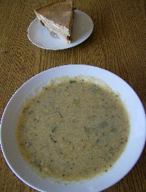 Kartoffel/ Kokosflockenbrei rein + Basilikumgrün gewiegt. Aufkochen + mit Gewürzsalz abschmecken.