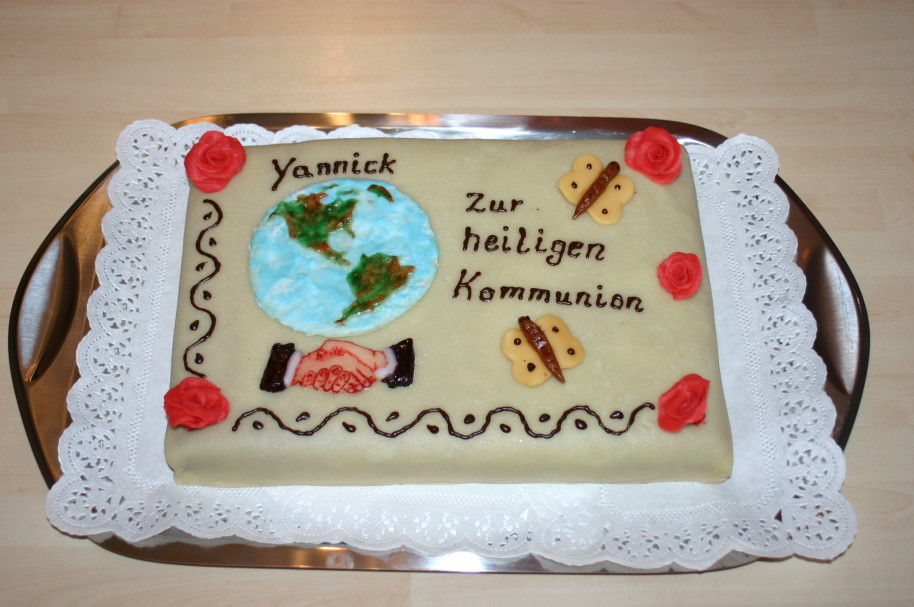 Mein Konditor ist schon ein paar Jahre im Beruf und so gestreßt, dass er wohl keine Lust auf Experimente mehr hat Er kennt sehr wohl das Einfärben von Marzipan, aber durch die Gelbfärbung bekommt er kein anständiges Blau zu stande, so sein Wortlaut. Ansonsten benutzt er Aprikosenmarmelade, die mit einem flachen Spatel auf ein Rundblech glatt gestrichen wird vor der Einfärbung. Aber damit sieht es mit einem schönen Blau noch viel schlechter aus . Und die normalen Kommunionstorten mit betenden Händen oder Bibel und altrosafarbenen Röschen, wie sie bei unserem Konditor standard sind, sind mir persönlich einfach zu bieder und einfallslos. Mit ein bischen Angachment und interesse denke ich, kann man viel schönes hin bekommen.