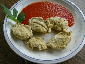 Man kann auch kleinere Klöße abstechen + in einer Gemüsesuppe garen.