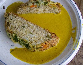 Reis in kochendem Salzwasser ca. 30 min garen. Möhre grob raspeln. Lauch in Ringe schneiden, Käse fein reiben. Reis abgießen, abtropfen las-sen. Mit Gemüse, Käse, Eiern, Quark, Nüssen + Paniermehl verkneten. Mit Salz, Pfeffer + Muskat würzen. Mit angefeuchteten Händen einen längli-chen Braten formen. Auf ein mit Backpapier ausgelegtes Backblech legen. Im vorgeheizten Backofen (E- ca. 200 C/ Gas: Stufe 3) ca. 45 min backen. Kräuter waschen trocken schütteln + (bis auf etwas zum Garnieren) fein wiegen, mit dem restlichen Käse vermischen + 15 min vor Ende der Gar-zeit auf dem Braten verteilen. Fett in einem Topf zerlassen, Curry + Mehl goldgelb darin anschwitzen. Mit Milch unter Rühren ablöschen + ca, 5 min köcheln lassen, mit Salz + Pfeffer würzen.