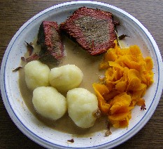 Dazu gab es Kartoffelklöße + Buttermöhren.