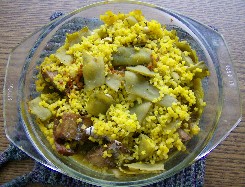 2 Tassen Wasser mit Kurkuma + 0,5 Tl gekörnte Gemüsebrühe zum ko-chen bringen, die abgespülte Hirse rein, Hitze runterstellen, Deckel drauf, nach 12 min ausstelle, ausquellen lassen, wird schön trocken + körnig.