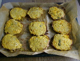 Käse etwas klein machen + zusammen mit den Eiern mit einem elektri-schen Pürierstab im Gefäß pürieren. In die Gemüsemasse geben + gut vermischen. Auf ca. drei Backbleche die mit Backpapier ausgelegt sind, auf jedem Blech ca. 12 Backlinge legen, etwas andrücken. In den kalten Backofen (alle drei zusammen ) bei ca. 180°C Umluft ca. 60 min backen. Dazu passt alles, z.B. kaltes ungekochtes Apfelkompott oder auch eine Tomatensoße.