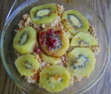 Kiwi schälen + in Scheiben schneiden + auf den Teig verteilen, in die Mitte