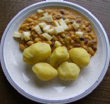 vor dem servieren den Schafskäse Portionsweise auf das Bohnengemüse geben, dazu entweder Pellkartoffeln oder Brot reichen.