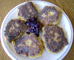 Handteller große Bratlinge formen ( mit nassen Händen ) in Mehl wenden, Öl heiß werden lassen, Bratlinge rein, und auf Mittelhitze stellen, Dauer richtet sich nach der Dicke der Bratlinge.