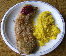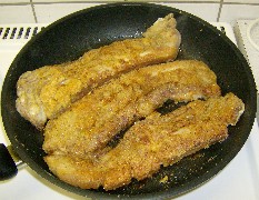 Ablaufen lassen, in das verquirlte Ei wenden, anschließend in das mit Salz angereicherte Buchweizen gem, wälzen, im heißen Fett braten, Dauer richtet sich ganz nach der Dicke der Scheiben.