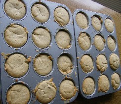 Alle trockenen Zutaten gut vermischen lassen, Flüssigkeit gemischt und Eier langsam zugießen und gut verrühren, zum Schluss die 2 El Margarine gut unterrühren, in die mit Fett eingestrichenen Muffeinsmulden etwas Sesamsaat und Leinsaat gut 1 El Teig füllen, an einem warmen Ort gehen lassen, oder im Backofen Ober- und Unterhitze Licht an, bis sich der Teig gehoben hat,