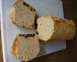 Backpulver mit Vanillepulver, Naturreis, Mandeln vermengen, und zu der Salz Milchmischung zu geben und gut verrühren lassen, ist sehr dünnflüs-sig, Rosinen versinken bis zum Boden, kann also auch entfallen, in eine mit Backpapier ausgefüllte 30 cm Kastenbackform gießen, in den kalten Backofen bei ca 140°C Umluft ca 100 min backen, Nadelprobe.