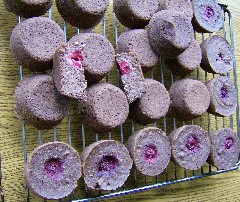 In den kalten Backofen bei ca 130°C Umluft ca 45 – 60 min evtl mehr, ba-cken, Nadelprobe, aber meist sieht man es auch, wenigstens 20 min ab-kühlen lassen, ein Brettchen drüberlegen, umdrehen , Formen abziehen, sollte sie noch warm sein, bitte ganz vorsichtig damit umgehen, sind sehr weich...
