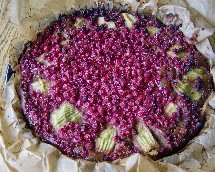 Kiwi schälen, weißen Strunk entfernen, vierteln, mit der Schnittfläche in den Teig, Außenrum verteilen, in die Zwischenräume nun noch die Beeren, verteilen, falls jemand mehr pflückt, kann auch die Kiwi weg lassen.