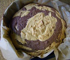 In die mit Backpapier ausgefüllte Ringform, abwechselnd mit einem Ku-chenschaber Teig in die Mitte , auf den Teig schichten.