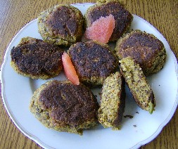 Den Rest Gemüse und den Rest Ölsaaten gut vermischen, mit der abgeseihten Soße sehr pikant abschmecken die 50 g gem Kichererbsen untermischen, und mit nassen Händen Bratlinge formen, im sehr heißen Fett legen, die Hitze reduzieren, und von beiden Seiten braten.