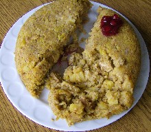 Beide Zutaten gebe man in eine große Schüssel, raspele Zucchini darüber, gebe die Gewürze sowie den Zucker darein, ebenso Zwiebel , Ananas und Kokosnuss, vermengen, gebe das Wasser dazu, und mit Salz kräftig wür-zen, dann erst das gem Kichererbsen, alles gut vermischen, und in den vier ausgefetteten feuerfeste Schüsseln verteilen, glattstreichen, Deckel schließen,