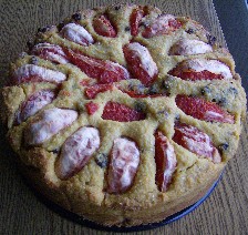 die oberste Lage Backpapier entfernen, den Teig auf den Mürbeteig gie-ßen, hin und her bewegen, so dass sich der Teig gut verteilt, füllt jetzt die Form fast aus, die Pampelmusenfilet mit der schmalen Seite in den Teig drücken, so das der Rücken auf gleicher Ebene wie der Teig ist, trocknet nicht so aus.