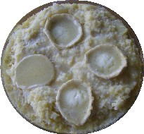 Eiweiß mit einer Prise Salz und Zucker steifschlagen, unterheben, in drei ausgefettete feuerfeste Schüssel verteilen, Ziegenkäse in dicke Scheiben legen, ca 12 Stück, auf den Auflauf verteilen, Deckel schließen,