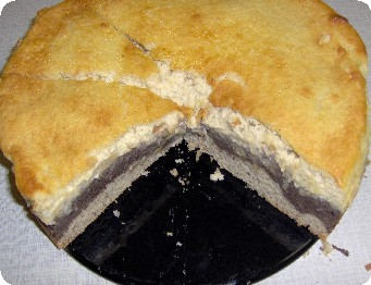 auf den geruhten Boden die Mohnmasse gießen, Glattrütteln, die abge-seihten geraspelten Äpfel darauf leicht verteilen, sowie die Ei-Sahne Mi-schung draufgießen, glattstreichen,