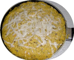 in eine 20 cm ausgefettete Bratpfanne geben, glattstreichen, den Rand freilassen, Ziegenkäse etwas raufraspeln, Deckel schließen, auf eine kalte Kochplatte stellen, mit Stufe zwei von sechs möglichen Stufen ca 60 - 80 min backen, den Deckel drehen, vorm abnehmen, der Auflauf sollte sich in der Pfanne schütteln lassen