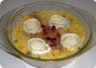 die Ziegenkäsefrischrolle in ca 12 Scheiben schneiden und je vier Stück auf das Gemüse verteilen, ein wenig reindrücken, in die freie Mitte des Auflaufs noch je 1 Tl Preiselbeeren a d Glas, Deckel schließen, in den kal-ten Backofen bei ca 150°C Heißluft ca 50 min backen, sollte gut sprudeln,