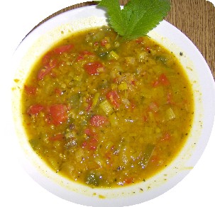 250 g Lauch in Scheiben schneiden und 2 Knoblauchzehen klein schnei-den, in heißem Fett andünsten, mit einem halben Teelöffel Curry ohne Salz und einem Teelöffel Kurkuma überstäuben , abgelöschte Linsen u 1 Prise Zucker dazu, ca 20 Minuten bei geringer Energiezufuhr garen,