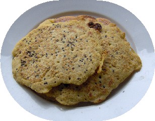 nach 2 Pfannkuchen habe ich noch 1 El Sonnenblumenöl in den rohen Teig gegeben, verrührt, gebraten beide Seiten goldgelb, eine Seite mit Schwarzkümmel, sie ließen sich besser braten und auch wenden, und wa-ren geschmackvoller.