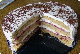 Den Tortenboden je nach Höhe zwei- bis dreimal durchschneiden und je-weils mit einer Schicht Preiselbeeren und Sahne bestreichen. Mit Sahne und Schokoladenstreuseln verzieren.