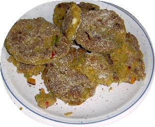Handtellergroße Bratlinge, flach drücken, und in grob gem Buchweizen wenden, und im heißen Fett (Öl) von beiden Seiten braten.