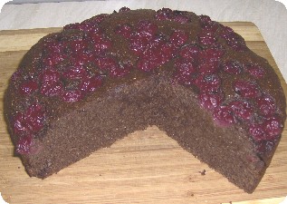 Naturreis, Amaranth und Nelken mahlen, mit Kakao, Backpulver, Salz, 200 g gemahlene Erdnüsse und Schokolade vermischen und in die Rühr-schüssel einrieseln lassen, den Rest Wasser dazu und alles gut verrühren lassen, entweder die abgetropften Kirschen nun noch untermischen, oder erst den Teig in eine mit Backpapier ausgefüllte Ringform gießen, glatt-schütteln und dann die Kirschen draufgeben ein wenig eindrücken, in den kalten Backofen bei ca 140°C Heißluft ca 100 min backen, Nadelprobe.