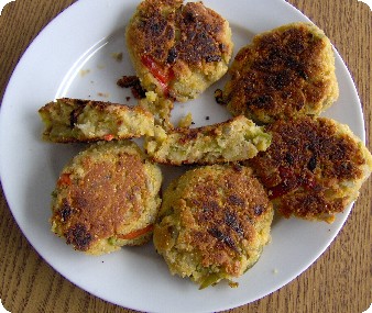 Zwiebel fein würfeln, im heißen Öl kurz braten in eine Schüssel mit den anderen Zutaten bis einschließlich Mais gemahlen, vermischen, es bleibt sehr weich der Teig, Bratlinge formen, und im heißen Fett von beiden Sei-ten auf reduzierter Hitze braten.
