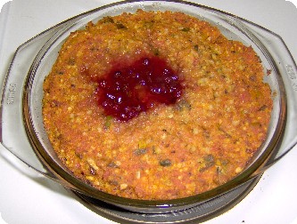 in zwei ausgefettete Auflaufformen verteilen, glatt streichen, in deren Mit-te jeweils 1 El Preiselbeeren a d Glas geben, Deckel schließen, bleibt saftig und es wird keine zusätzliche Soße benötigt.