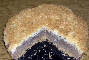 wenn Kuchen fertig gebacken, die zerlassene Margarine über die Kokos-nuss gießen, Esslöffelweise,