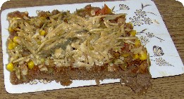 Ds. Tomaten in eine Schüssel geben und mit Ds. Mais und 100 g TK Papri-kaschotenstreifen, Champignons etwas schneiden, Majoran, Basilikum, Zucker, gemörserten Pfeffer, und gemahlenen Naturreis sowie abgeseih-ten Tofu, vermischen, mit der Lake pikant abschmecken,
