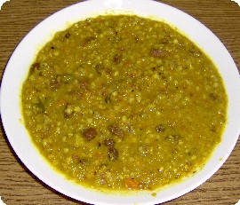 2 l Wasser zum kochen bringen, Lorbeerblatt und TK Suppengemüse rein, nach wiederum aufkochen Hitze reduzieren, Kokosnuss geraspelte, Kur-kuma, Curry ohne Salz, ( wer Curry mit Salz nimmt, bitte erst nach Fer-tigstellung des Eintopfes ), Pfeffer, Buchweizenkörner sowie Sultaninen, Deckel schließen.