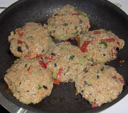 1 Tasse Naturreis in zwei Tassen kochendes Wasser geben, aufkochen, Deckel schließen, ca 35 min bei reduzierter Hitze kochen, Hitze ausstellen und noch 10 min quellen lassen, in eine Schüssel geben, alle anderen Zu-taten bis einschließlich Hefeflocken, dazu und vermengen, mit nassen Händen, ( ist die einzige Flüssigkeit ) flache Bratlinge formen, diese in heißem Fett von beiden Seiten braten.