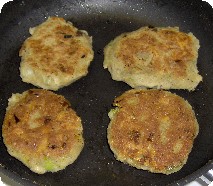 diese Masse in eine Schüssel geben, TK Lauch, Paprikagranulat, Zucker und Salz untermischen, soviel Kochflüssigkeit zugeben, dass ein etwas di-ckerer Brei entsteht, ein wenig Buchweizengrieß zugeben, mit nassen Ess-löffel Teig abstechen, im heißem Öl braten, beim wenden sehr vorsichtig, fällt sonst auseinander,