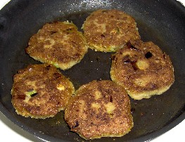 Öl erhitzen und einen Probebratling herstellen, mit nassen Händen, bitte nicht zu groß, eher klein, Hitze unbedingt reduzieren, sonst werden diese zwar außen dunkel eher schwarz, innen bleiben sie roh, von beiden Seiten braten, Vorsicht beim einmaligen Umdrehen, Dauer, man sieht es, Ge-fühlssache, sollte es wieder Erwarten doch nicht klappen, noch etwas Mehl zugeben, bitte nicht zuviel, sie werden sonst fest, nicht erwünscht,