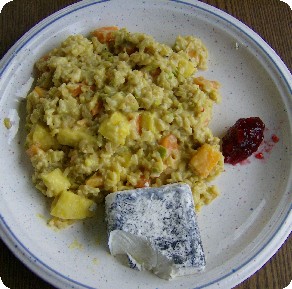 Den Lauch zum fertigen Reis geben, mit den Gewürzen abschmecken, Sahne hinzu, sowie das Obst unterheben.