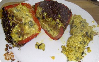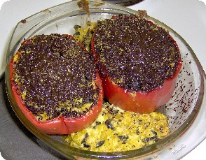 Reis mit 0,5 Tl gemörserten Koriander, 1 Tl Kurkuma, 2 El Kokosraspel, 1 Prise Zucker, 1 Tl Kräutersalz, 20 feingehackte schwarze Oliven vermi-schen, kleingeschnittene Banane unterheben und mit 100 g Kokosnuss-milch vermischen, diese Masse in die zwei bissfeste Paprikaschoten füllen, diese wiederum in eine mit Margarine ausgefettete Auflaufform stellen, den Rest der Masse so platzieren, dass die Schoten einen Halt erhalten,