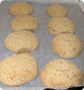 alle Zutaten verrühren dann auf Stufe I ca 12 min verkneten lassen, sollte nur so schnell sein, dass sich der Teig vom Schüsselrand löst, dann diesen Ballen in 8 Teile schneiden, ein wenig runden, auf ein mit Backpapier aus-gelegtes Backblech legen, ein Lage Backpapier drüber, ab in den Backofen bei 50°C Ober- u Unterhitze Ruhen, Backofen auf 190°C Ober- u Unterhit-ze vorheizen und ca 20-22 min backen, Nadelprobe.