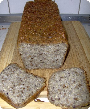 Sonnenblumenkerne rösten, bis sie duften dann erst die getrockneten Rosmariennadeln zugeben, mit rösten, abkühlen lassen, mit allen anderen trocknen Zutaten in die Rührschüssel einer Küchenmaschine geben und gut vermischen, Sonnenblumenöl mit 1 kg kohlensäurehaltiges Mineral-wasser verrühren, in die laufende Küchenmaschine langsam zugeben, wenn alles vermischt, den Rührhaken gut 6 min auf fast Höchstgeschwin-digkeit laufen lassen, kurz vor Ende noch den Obstler zugeben. In der Zwischenzeit die 35 cm Kastenbackform mit Backpapier ausfüllen, da hin-ein den Teig gießen, glattschütteln, und in den Backofen bei Ober- und Unterhitze bei 50°C und Ruhen und Gehen lassen,