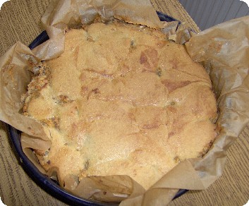 die 26 cm mit Backpapier ausgefüllte, den Boden mit 150 g gem Nacktha-fer, bedecken,