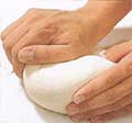 Wenn diese Kreisbewegungen richtig gemacht werden, drückt Ihr automatisch mit den Fingerkuppen, dem Handballen und vorallem mit dem Daumen den äusseren Rand des Teiges in die mitte (also genau wie oben beschrieben); wodurch Ihr nach 4-5 Kreisungen eine schöne runde Kugel habt.