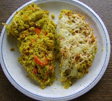 Mit 100 g geraspelten Gauda belegen + darauf Paprikagranulat streuen, vorsichtig nicht zu viel, scharf genug das Essen.