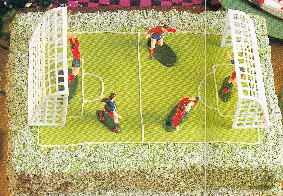 4. Feldlinien mit ungefärbte Creme aufspritzen. Tore und Spieler aufstellen.