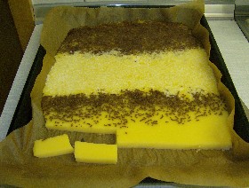 in eine mit Backpapier ausgefüllte Fettpfanne gießen und fest werden las-sen.
