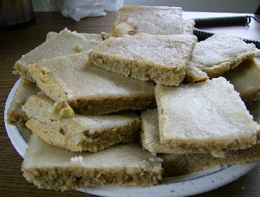 Auf den heißen Kuchen, jetzt den heißen Guss drüber streichen, ich nahm einen Kuchenteigschaber. Entweder jetzt oder erst wenn der Kuchen aus-gekühlt, in Stücke schneiden.